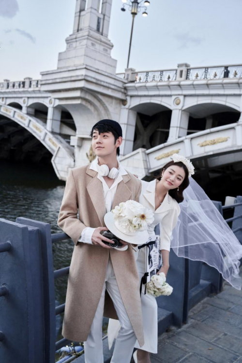 身着一身翻领西服制式的修身白色礼服,脚穿一双简单大方的白色细高跟,搭配珍珠耳坠和白色花环发饰,充满法式优雅气质。随意走在街上,镜头将一身复古穿搭与带着欧式风情的大桥、一望无垠的天空、荡漾着微波的洱河融为一景,打造一张充满浪漫复古风味的婚纱大片。